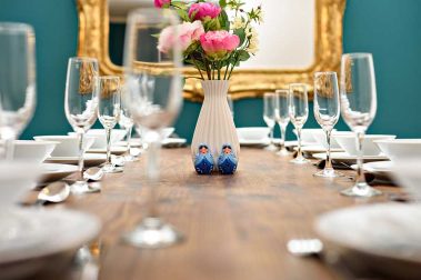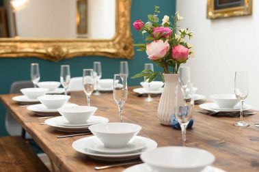 A huge industrial style dining table is provided, which accommodates up to fifteen people.