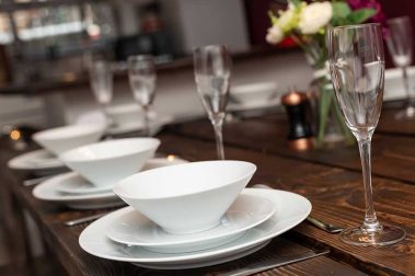 A huge industrial style dining table is provided, which accommodates up to ten people.